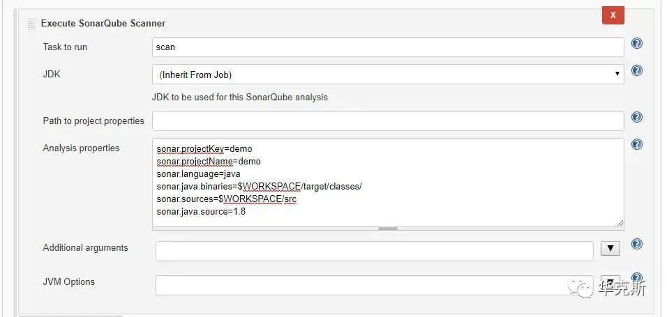 在“Task to run”中輸入scan,即分析代碼。在“Analysis properties”中輸入下面(miàn)内容。sonar.language 指定了要分析的開(kāi)發(fā)語言(特定的開(kāi)發(fā)語言對(duì)應了特定的規則),sonar.sources 定義了需要分析的源代碼位置(示例中的$WORKSPACE 所指示的是當前 Jenkins 項目的目錄),sonar.java.binaries 定義了需要分析代碼的編譯後(hòu) class 文件位置;sonar.java.source 指定java版本。